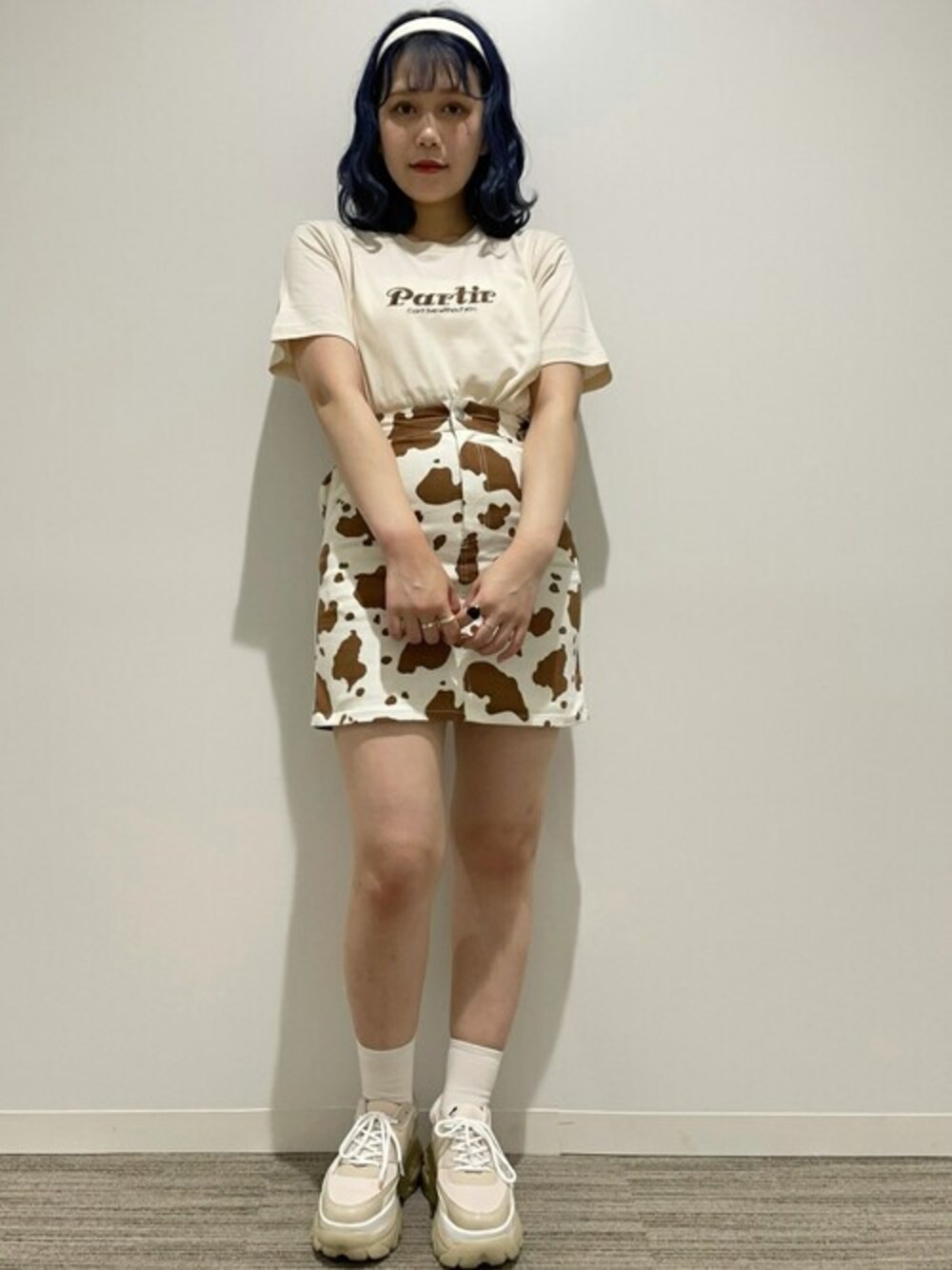 【2021春夏新作】 トレンドの牛柄ミニスカート❤︎ Tシャツもベージュの色を選んでまとまりを出してみました^^ 厚底スニーカーはとにかく脚が盛れるのでおすすめアイテムです! ! ★毎月5のつく日は「10%OFF」WEGOZOZOTOWN限定★ 気になったアイテムはぜひお気に入り登録を♪