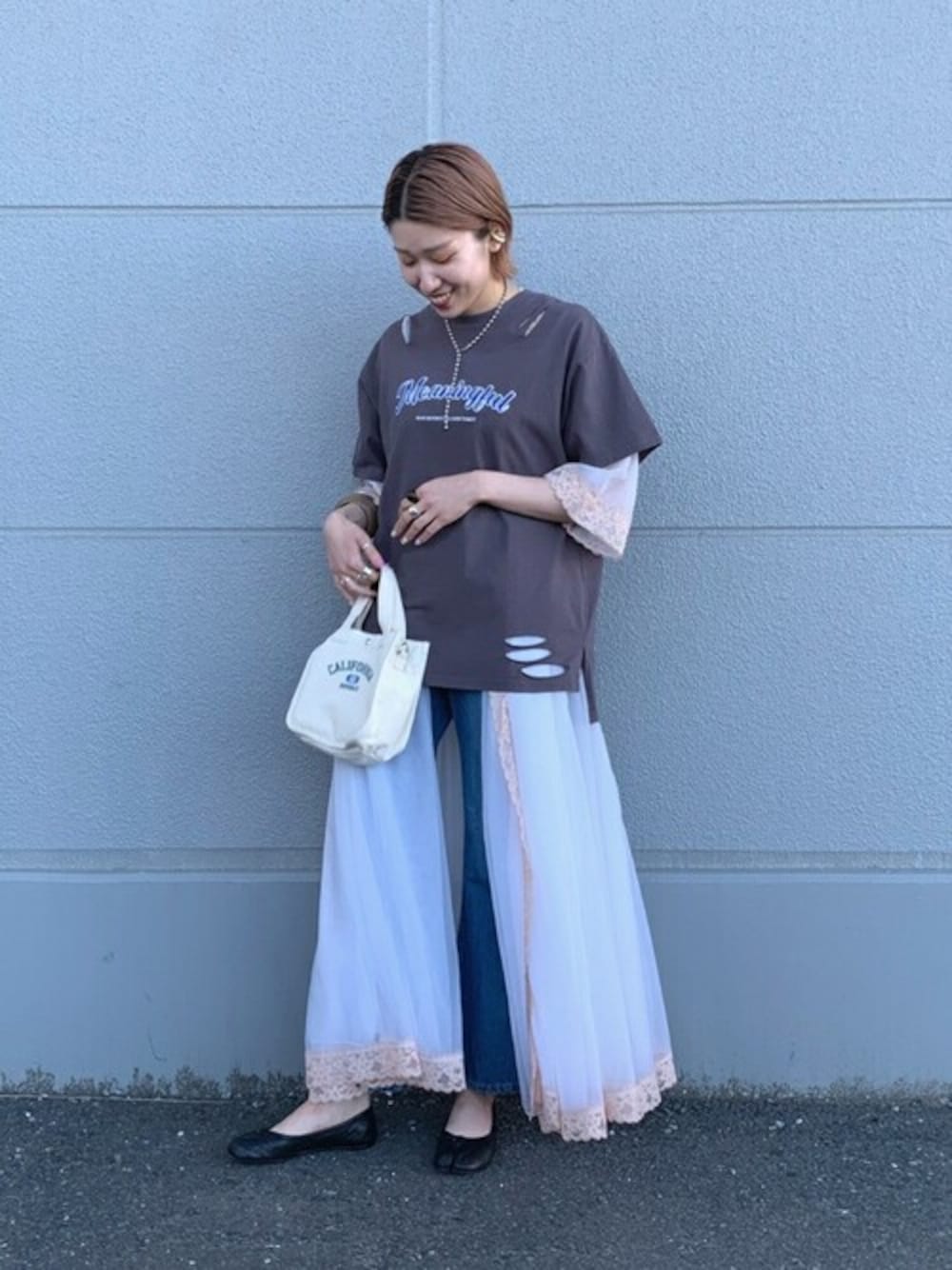 WEGO(WEGO STAFF)のTシャツ/カットソー「WEGO/ツイルワッペンダメージビックシルエットTシャツ」を使ったコーディネート