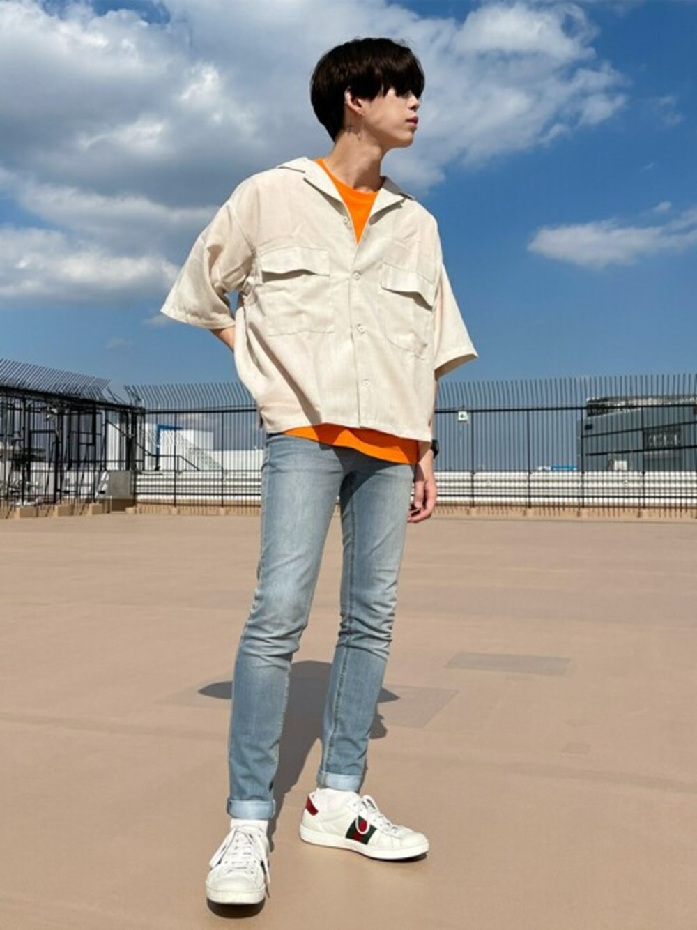 今年オススメビタミンカラーのオレンジを差し色に♪ スキニーで合わせてすっきりしたスタイリングに!