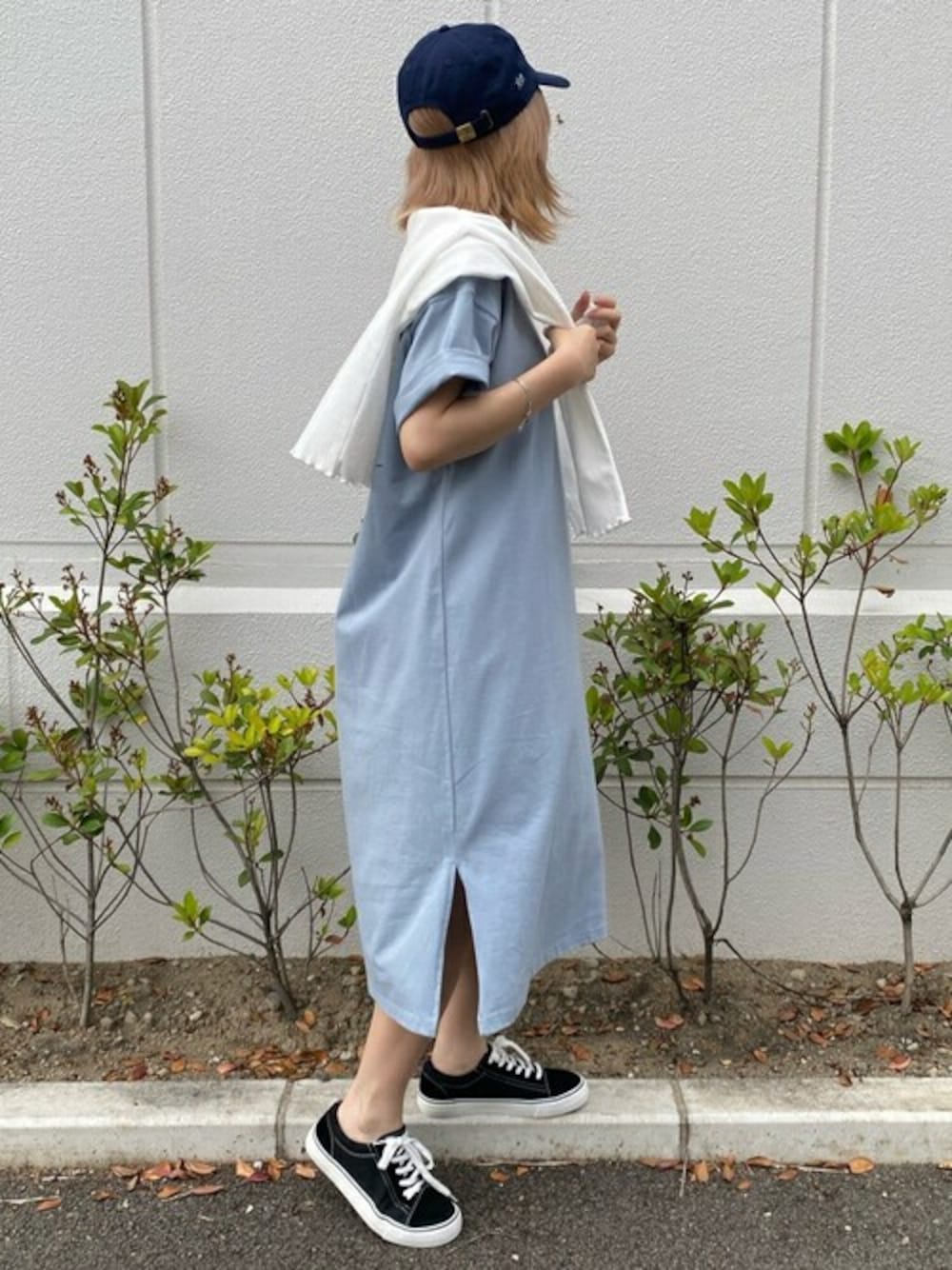 さらっと1枚で着れるワンピースはこれからの季節に◎ スニーカーとキャップでラフに。