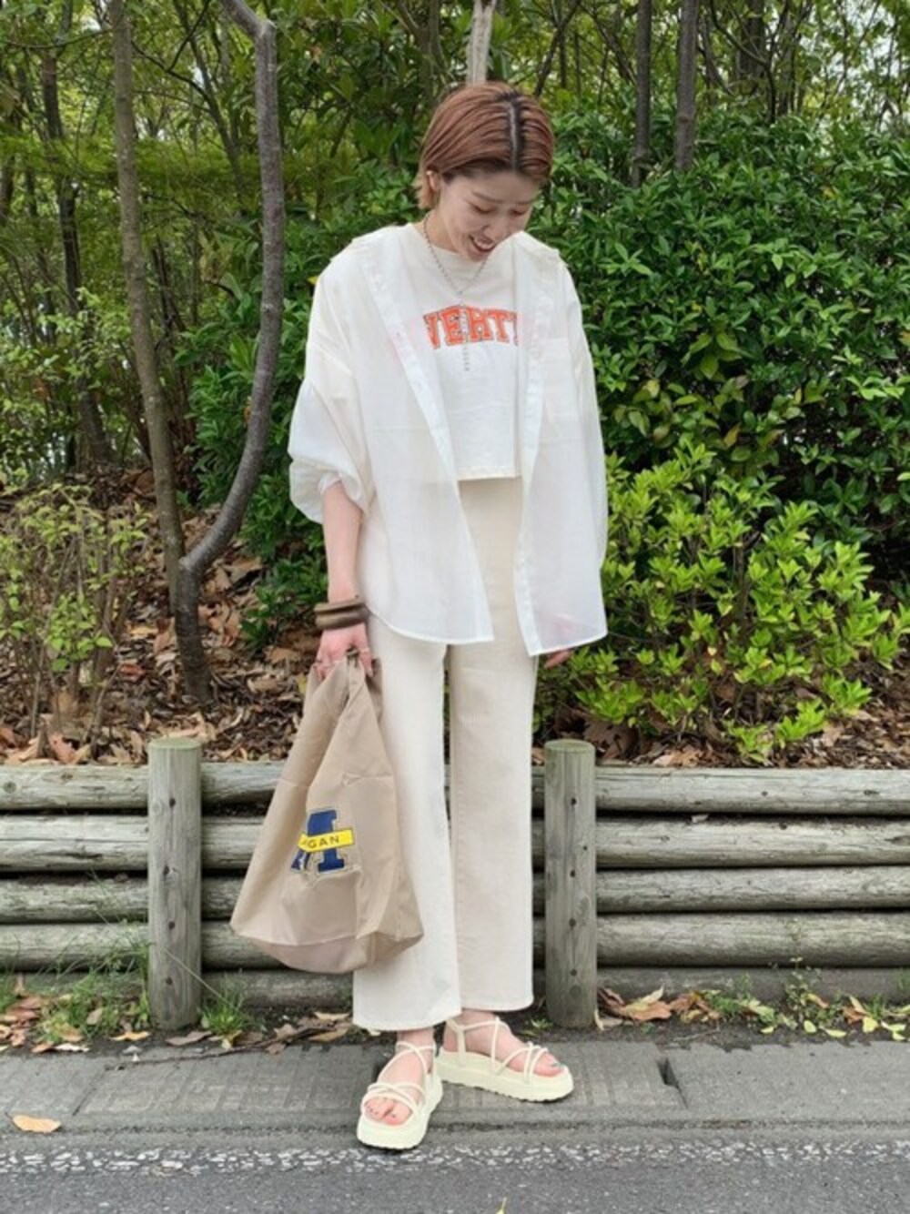 ホワイトでまとめたワントーンコーデ! シアーシャツは透け感があるので女性らしい印象に!