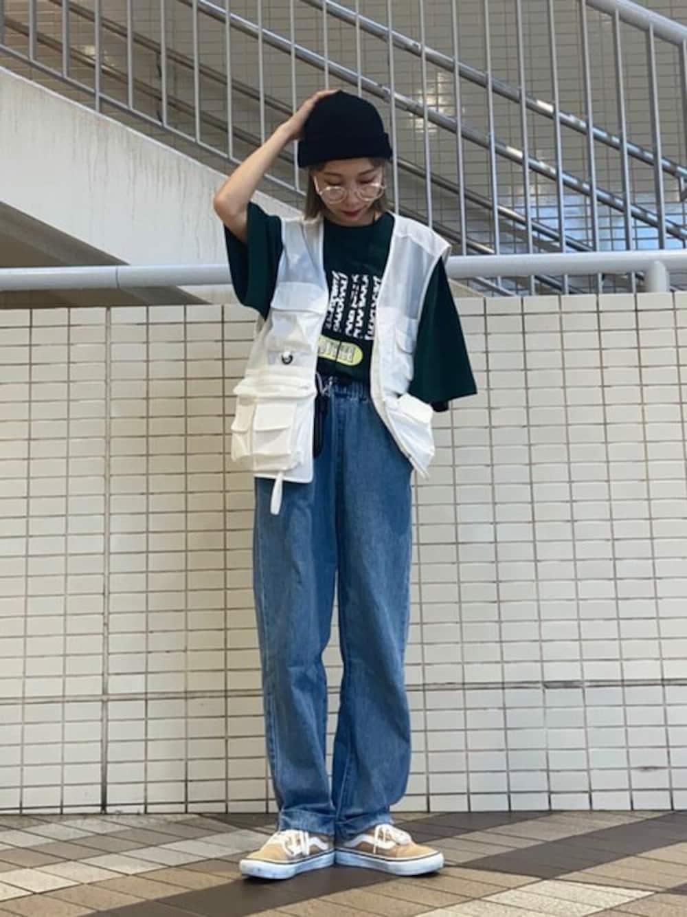 スケーターファッション! デニムは着回し抜群◎ フィッシングベストでお洒落感up! クリアメガネがよく合います^^