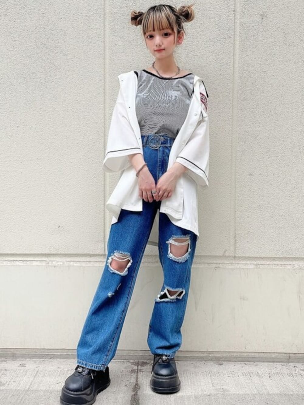WEGO(WEGO STAFF)のデニムパンツ「WEGO/クラッシュデニムストレートパンツ」を使ったコーディネート