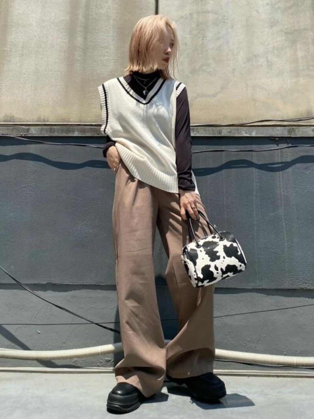 年中着れるニットベストは一枚は持っておきたいアイテム◎ ワイドスラックスはローファーとの相性抜群です!