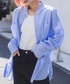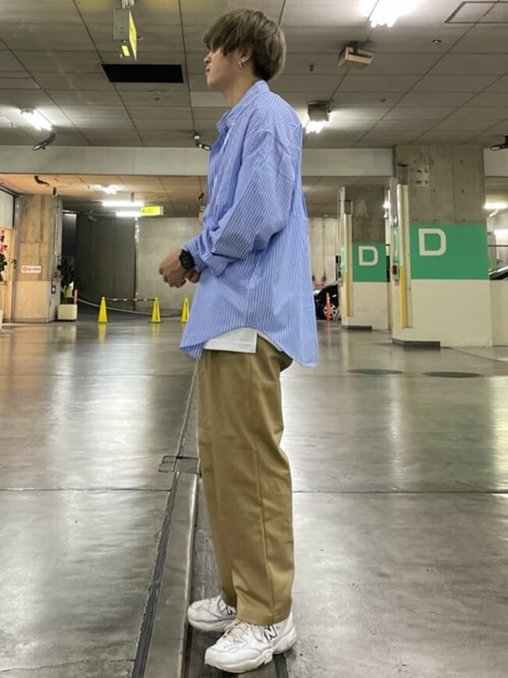 大人っぽいストライプシャツにベージュパンツを合わせた清潔大人コーディネート!!
