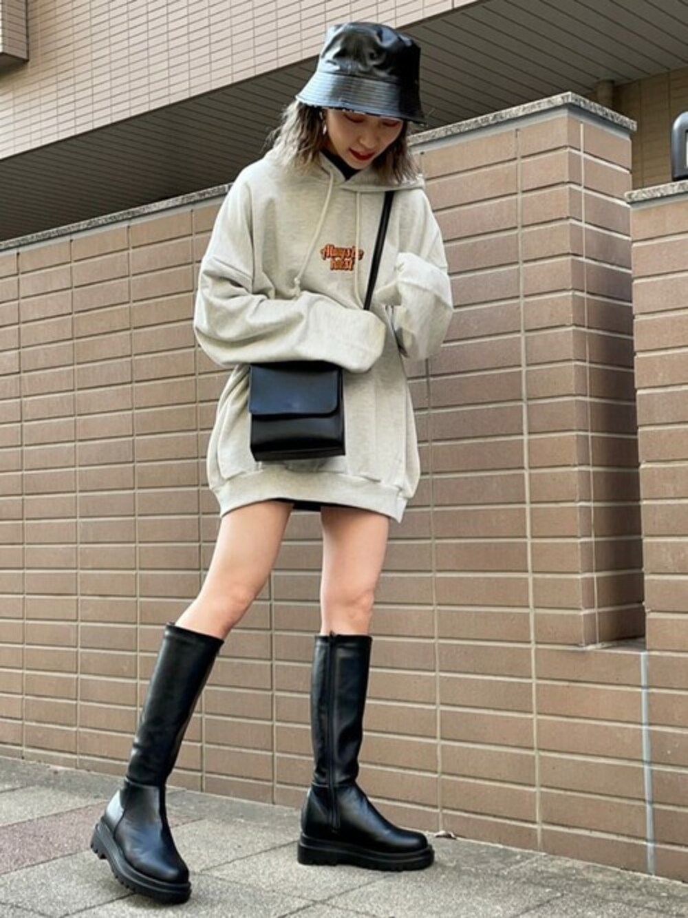 ビッグスウェットをワンピ風に着て ロングブーツとあわせた 今っぽいストリートスタイル! 女の子らしさも残っていてかわいいです!