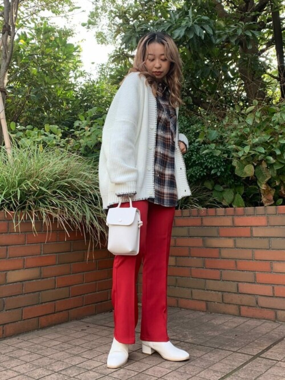 カーディガンのインナーに迷ってる方!! ロンTも良いけど、チェックシャツで 季節感を出すのもおすすめ☺︎ カラーパンツを差し色にまとまりある コーデになります!!