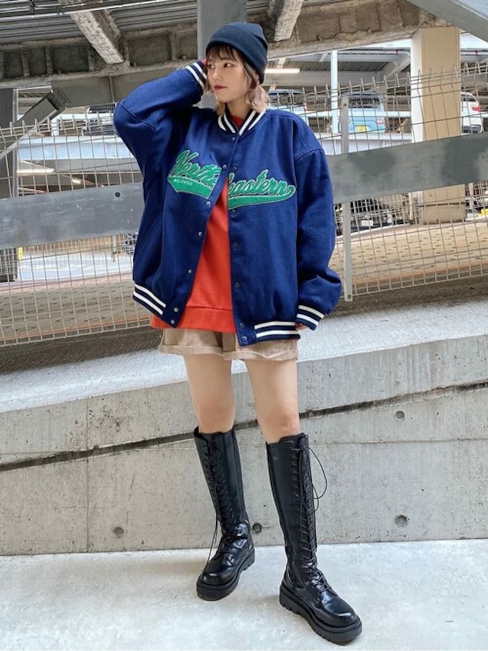 スタジャン×ロングブーツのアメカジストリートコーデ☺︎! スタジャンはショートパンツやミニスカートなど丈の短いボトムスとの合わせもオススメです♡
