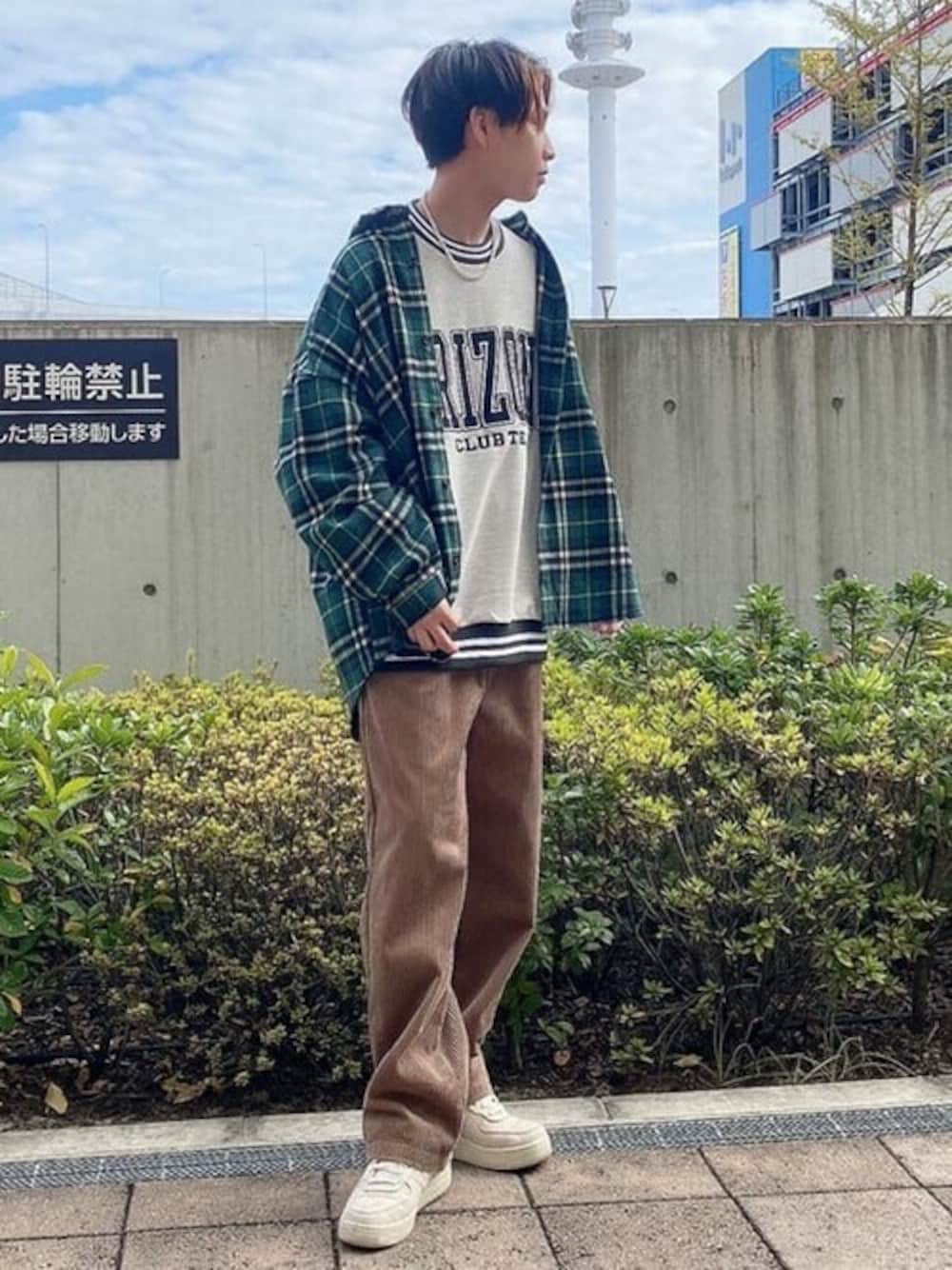 人気のグリーンカラーを取り入れたコーディネート☆ チェックシャツとコーデュロイパンツは秋冬にマストのアイテム!! ロゴのスウェットでトレンド感をプラス☺✨