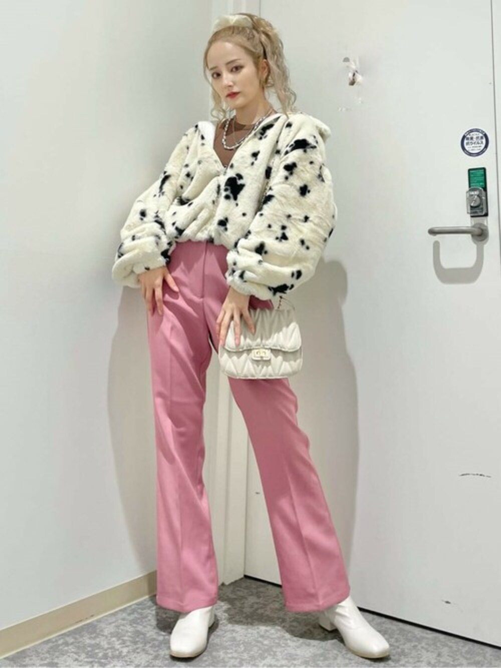 レディースおすすめのファーアウターは、 流行りのピンクと合わせて大人ガーリースタイル ♡ パンツのピンクと、他のアイテムをホワイトで統一することで統一感が出ます! インナーは少し大人っぽさを出す為にブラウンを選びました♥