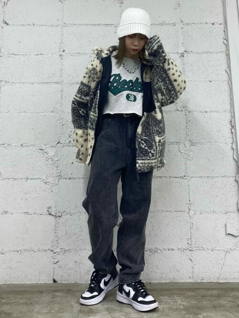 ボアアウターはメンズのアイテムですが女の子が着ても大きめで着れて可愛い⚡︎⚡︎ マムパンツははLサイズをチョイス! ウエストや太もも周りが緩く履けてストリート感をアップしてくれます☺️
