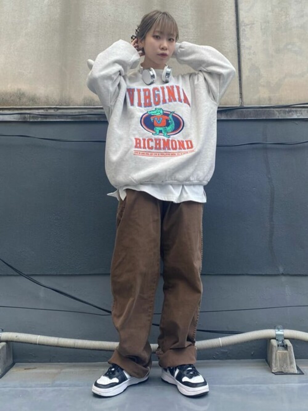 古着のボトムスを使った古着MIXコーデ🤍🤎 チームロゴ刺繍スウェットは1枚でオシャレ見えするインパクト大なデザイン!
