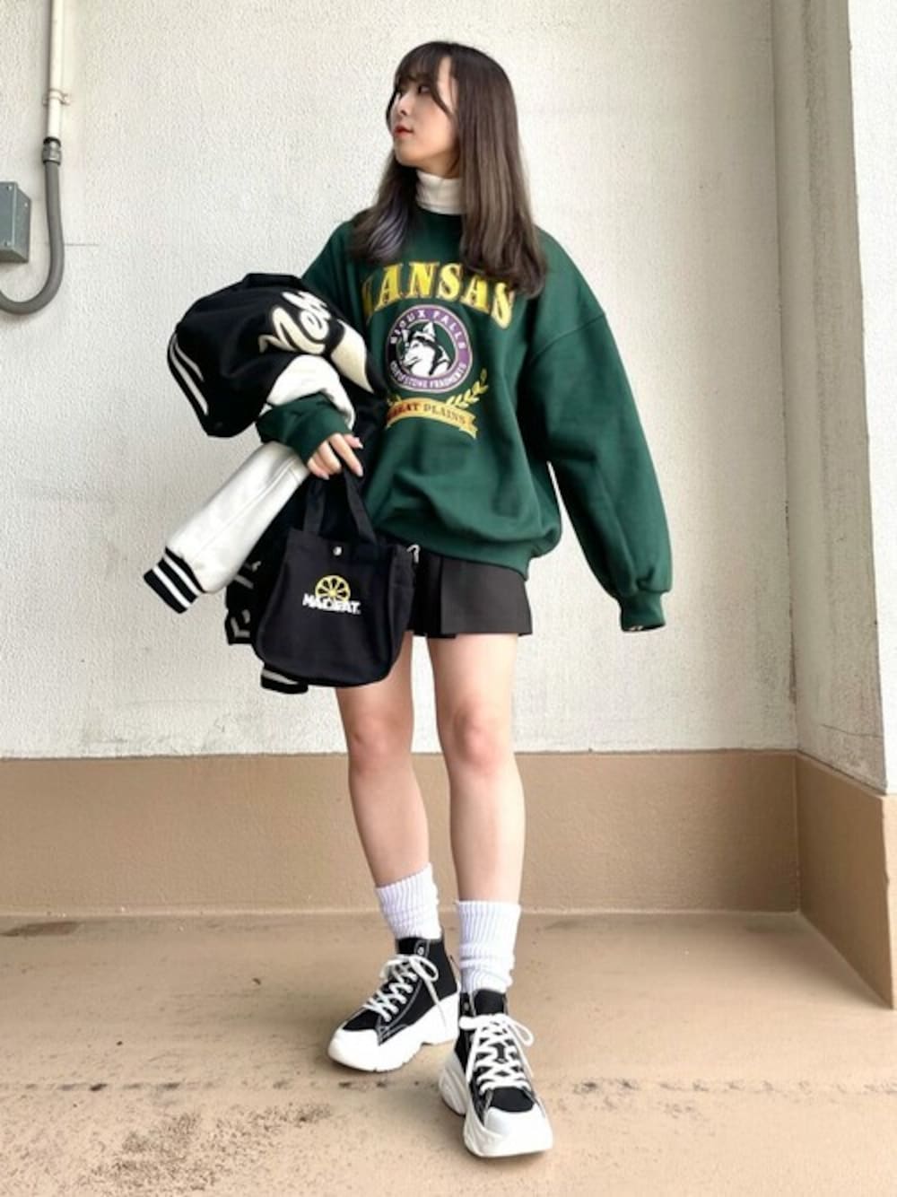 大きめスウェットがマスト!! タートルネックのインナーをプラスするのがお洒落ポイント!! プリーツスカートと組み合わせたミックスコーデがかわいいですよ〜!^^