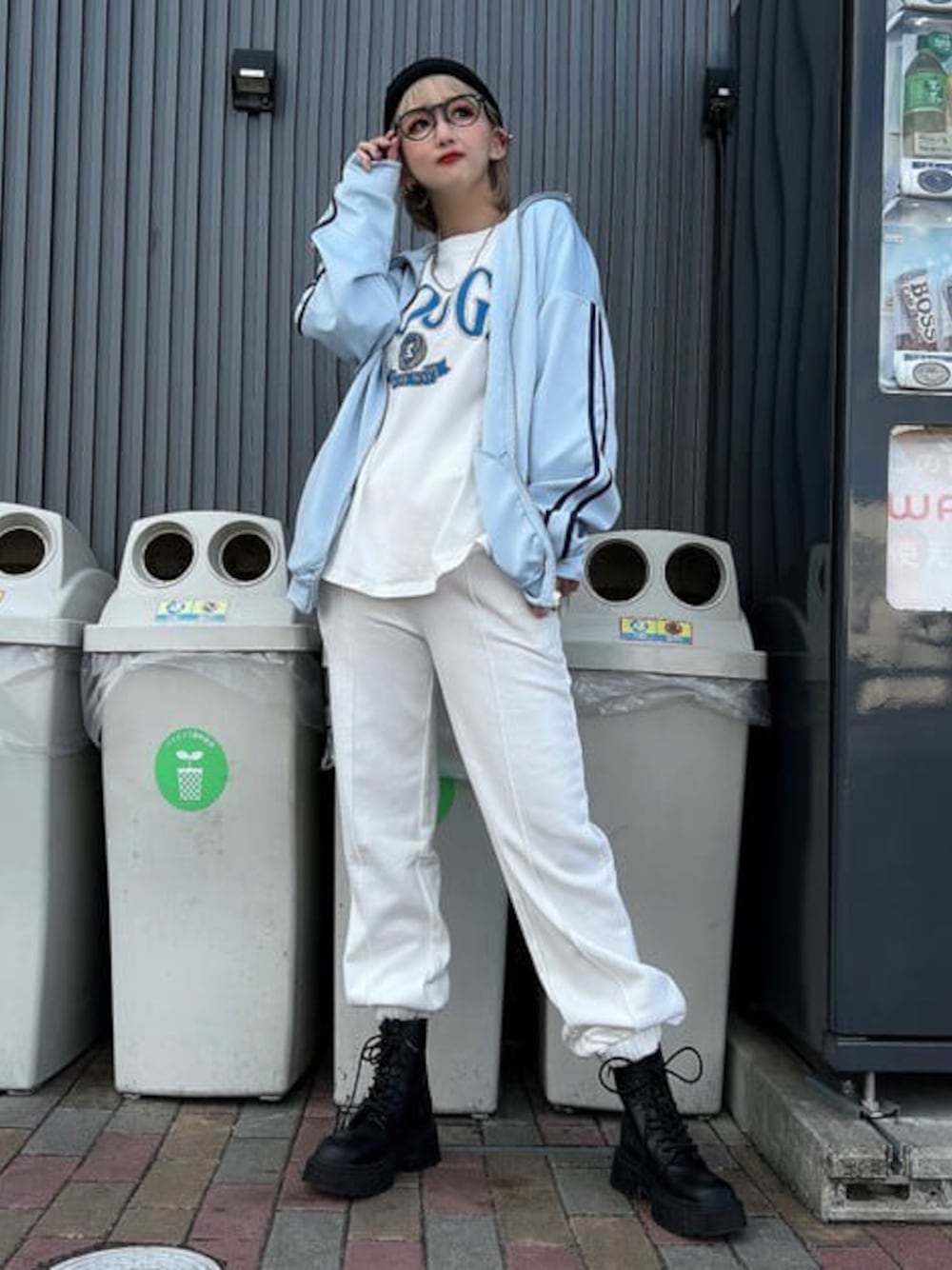 今、密かにブームになっている ライントラックジャケットは ユニセックスで着用できます☺︎ ピンタック仕様のスゥエットパンツ と合わせてスタイル良く◎