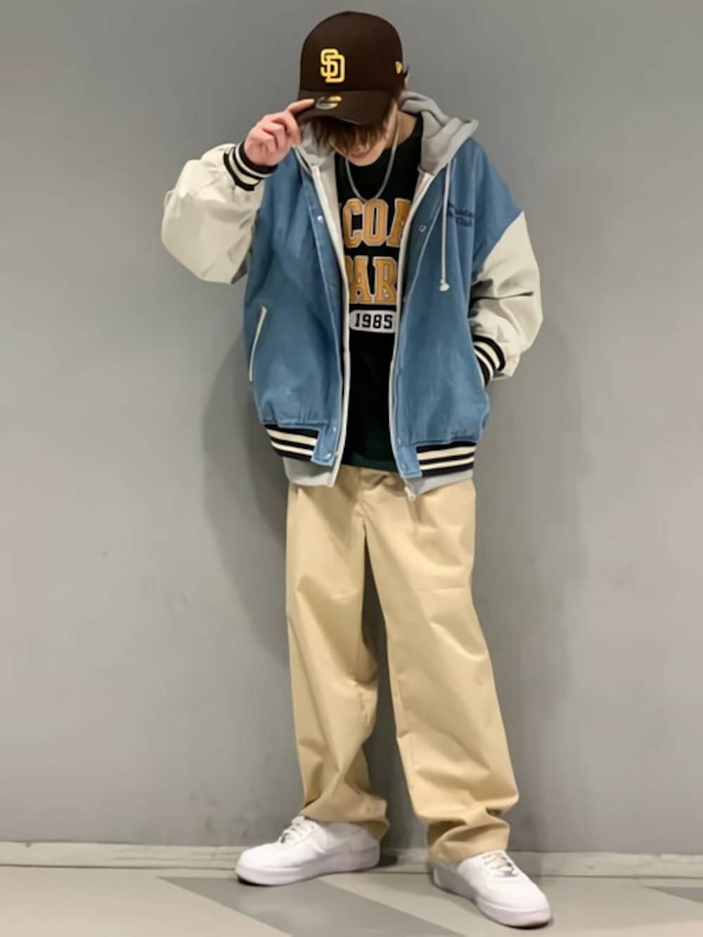 古着っぽく見えるスタジャンはチノパンと合わせてよりストリートな印象に!! 春におすすめアウターです☆