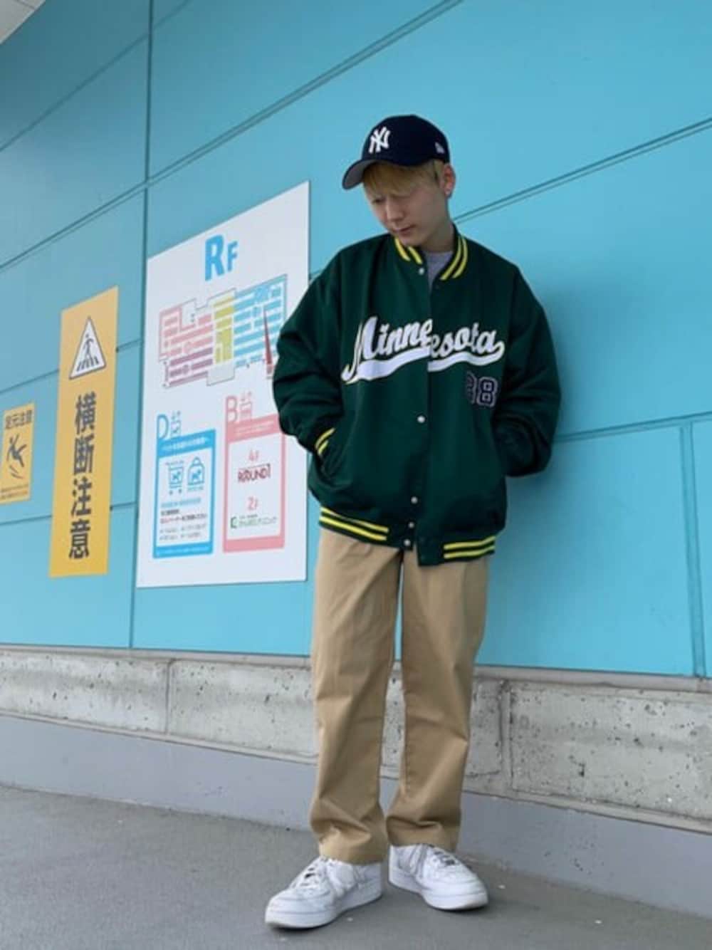 ワッぺンスタジャンとスウェットで楽な感じにコーデを組みました! キャップを取り入れることでよりストリート感増すのでとてもおすすめです◎ やっぱグリーンとベージュ、組み合わせ最高…!