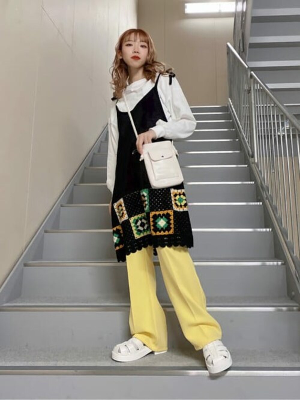 大人かわいいクロシェニットのキャミワンピを使ったコーデ!! 春らしくイエローのパンツを合わせました(*¨*)