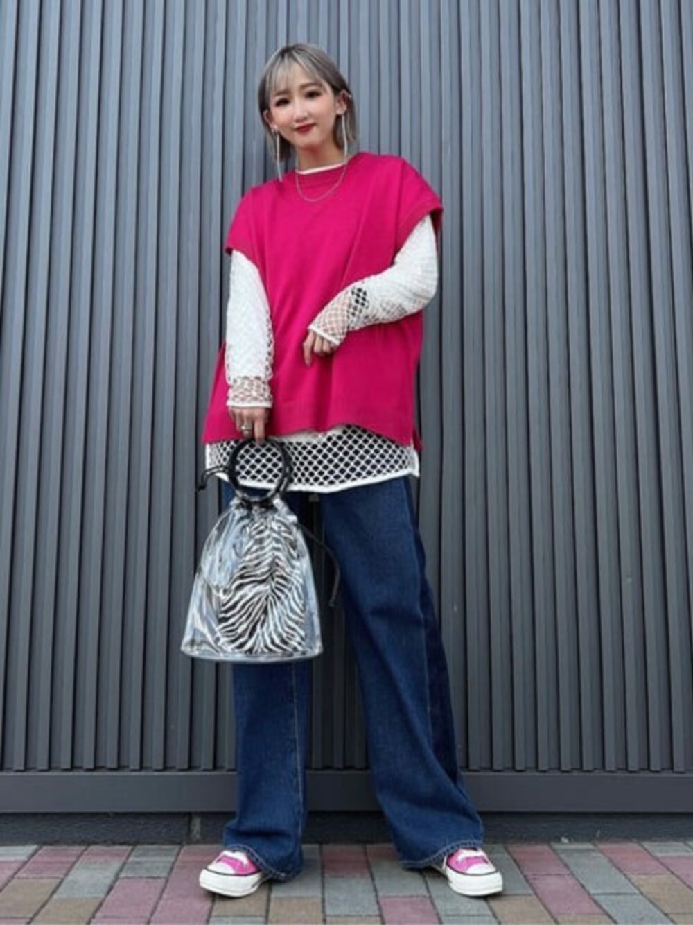 メンズのニットベストに トレンドのメッシュTの組み合わせは 高見え抜群です!! メンズアイテムですが、私も実先に リアルバイしちゃいました♡♡ 女の子だとゆったりオーバーシルエットに 着れるので最高なんですよ~♬ サイドのラインがお洒落なデニムパンツは 体型が気になる方でもスタイルよく見える シルエットなのでおすすめ☺︎♡