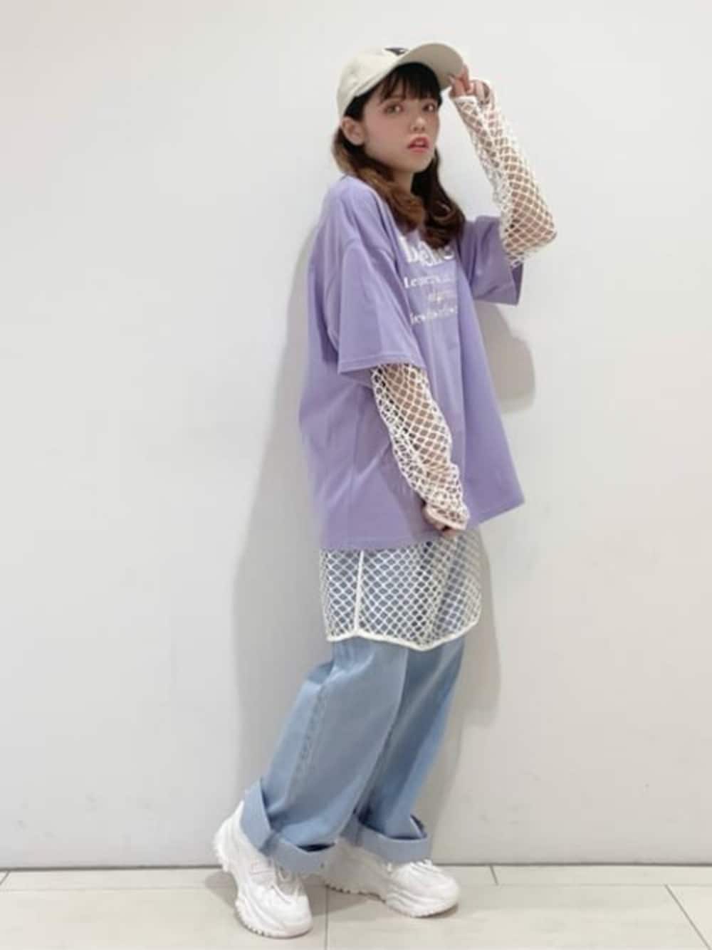 人気のメッシュロンTを使ったカジュアルコーデ!半袖TEEの中にインナーとしてメッシュロンTを着用しました!☆薄めのパープル×ホワイト×淡色デニムの組み合わせが春っぽい!♡