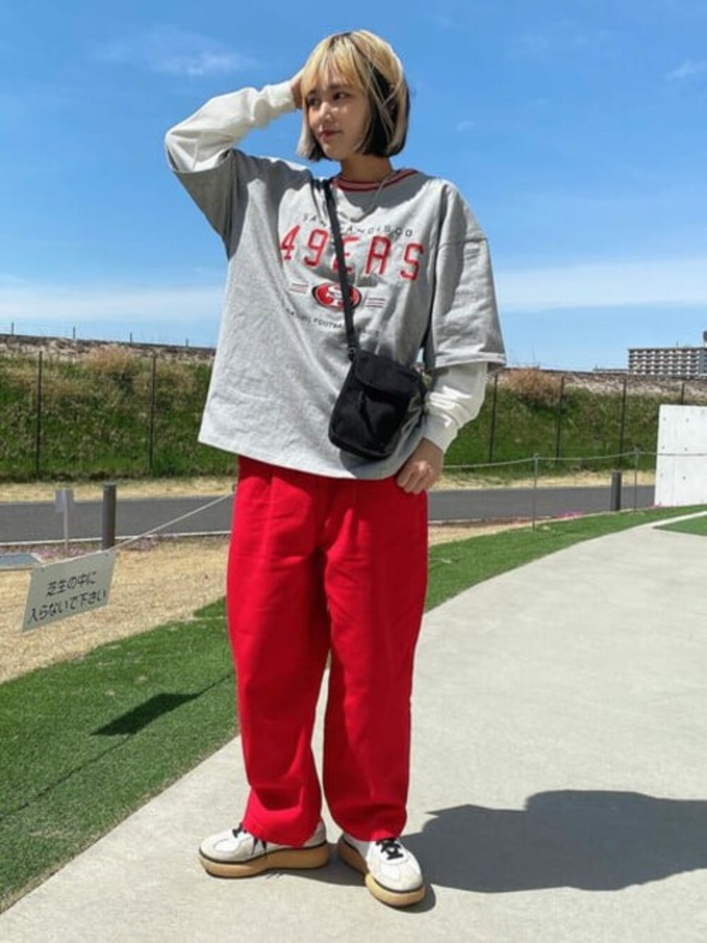 NFLの半袖TシャツはロンTとのレイヤードがカッコよくてオススメ! ロゴとパンツの色を赤で合わせて統一感!