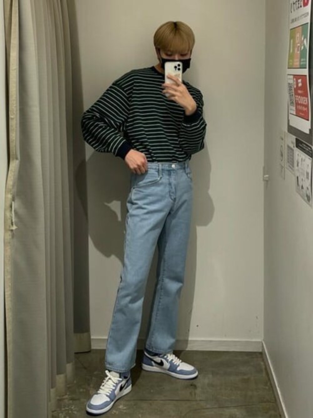 万能デニムと万能ロンT!! 無難な組み合わせですが、ロンTはボーダー デニムはフレアパンツをチョイスしてアクセントを追加!! 流行りの韓国コーデとストリートの両方が、ひろえちゃいます◎