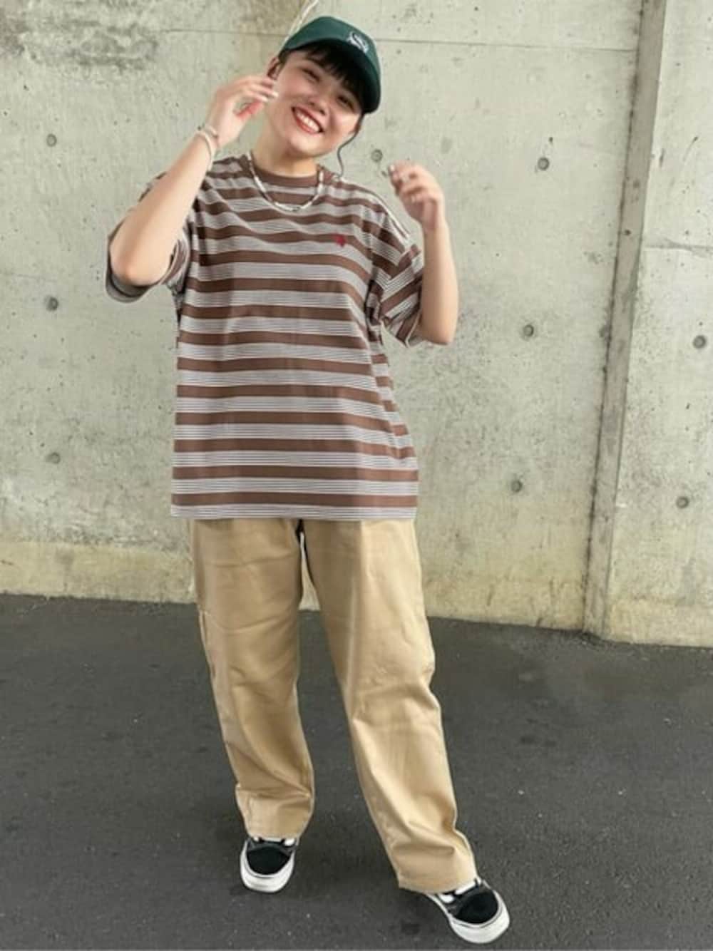 ブラウンでまとめて落ち着いた色味コーデになります! 大人カジュアルな印象でシンプルですが、パールネックレスや キャップでかわいい女性らしさも感じれて◎