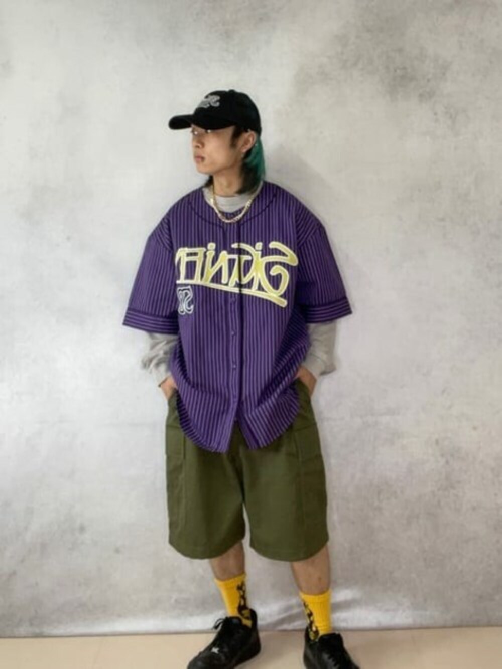 新作のスタジアムBIGシャツを使ったコーデになります! まだ夜は涼しいのでインナーでロンT着てみました!トップスもパンツもダボッとした感じで超Chillなラッパーて感じでよいよい!◎ トップスに紫、ソックスは黄色、、、強めの色をカーキのパンツが上手くまとめてくれちゃうねん!!