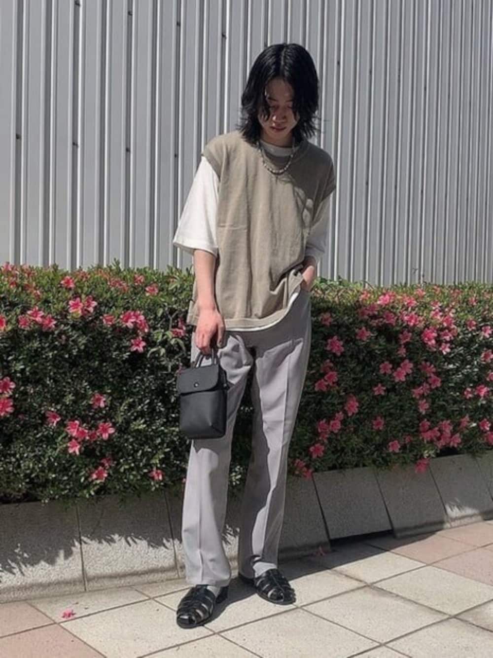 ワントーンで大人っぽさ間違いなし! このフレアスラックス、生地薄いので夏におすすめ! ワントーンにまとめたことで男性女性問わず大人っぽさが出せます★