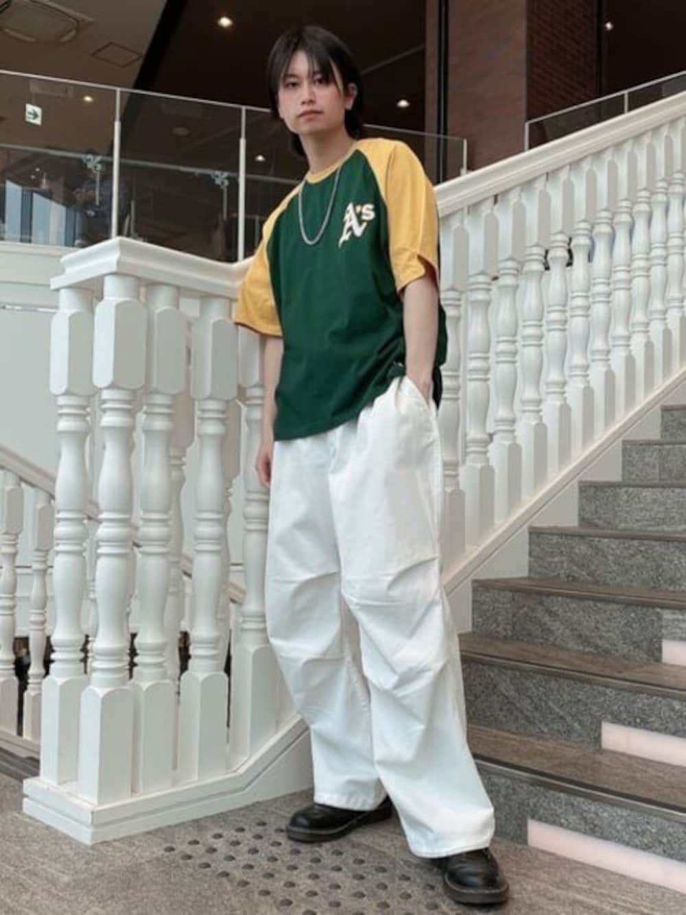ホワイトのミリタリーパンツにグリーンとイエローのシャツが映えます! 長めのネックレスで男らしさも⭕️ ストリートスタイルにあえて革靴を合わせるのも バランスが取れてい良き!!