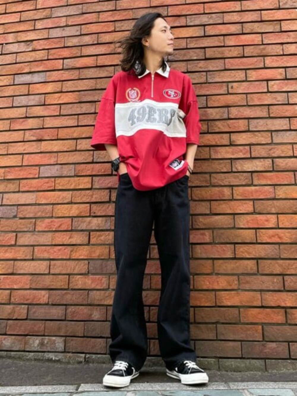 NFL別注チームロゴハーフZIPシャツを使ったコーディネートをご紹介します! ブラック基調のコーデに赤がとても映えます!! NFLアイテムのストリート色をうまく中和してくれる、ワイドブラックデニム優秀です★