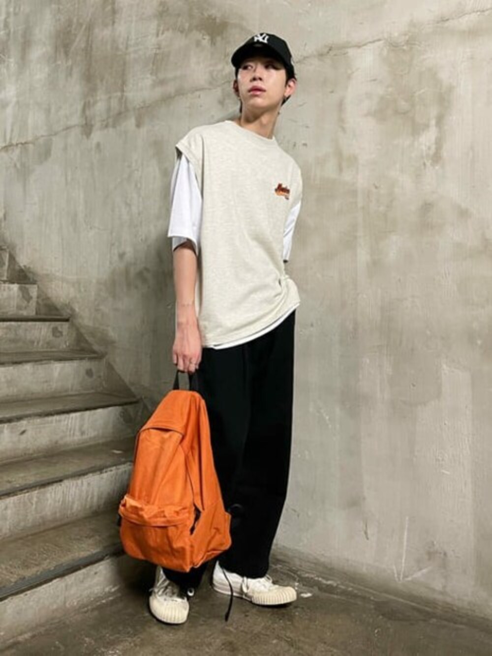 きれいめモノトーンコーデ!! 差し色のオレンジバックパックがいい味出してます★ カジュアル色が強い物を使うときは、シンプルなカラー、デザインを選ぶと 大人感+遊びの完璧構成ができます!!
