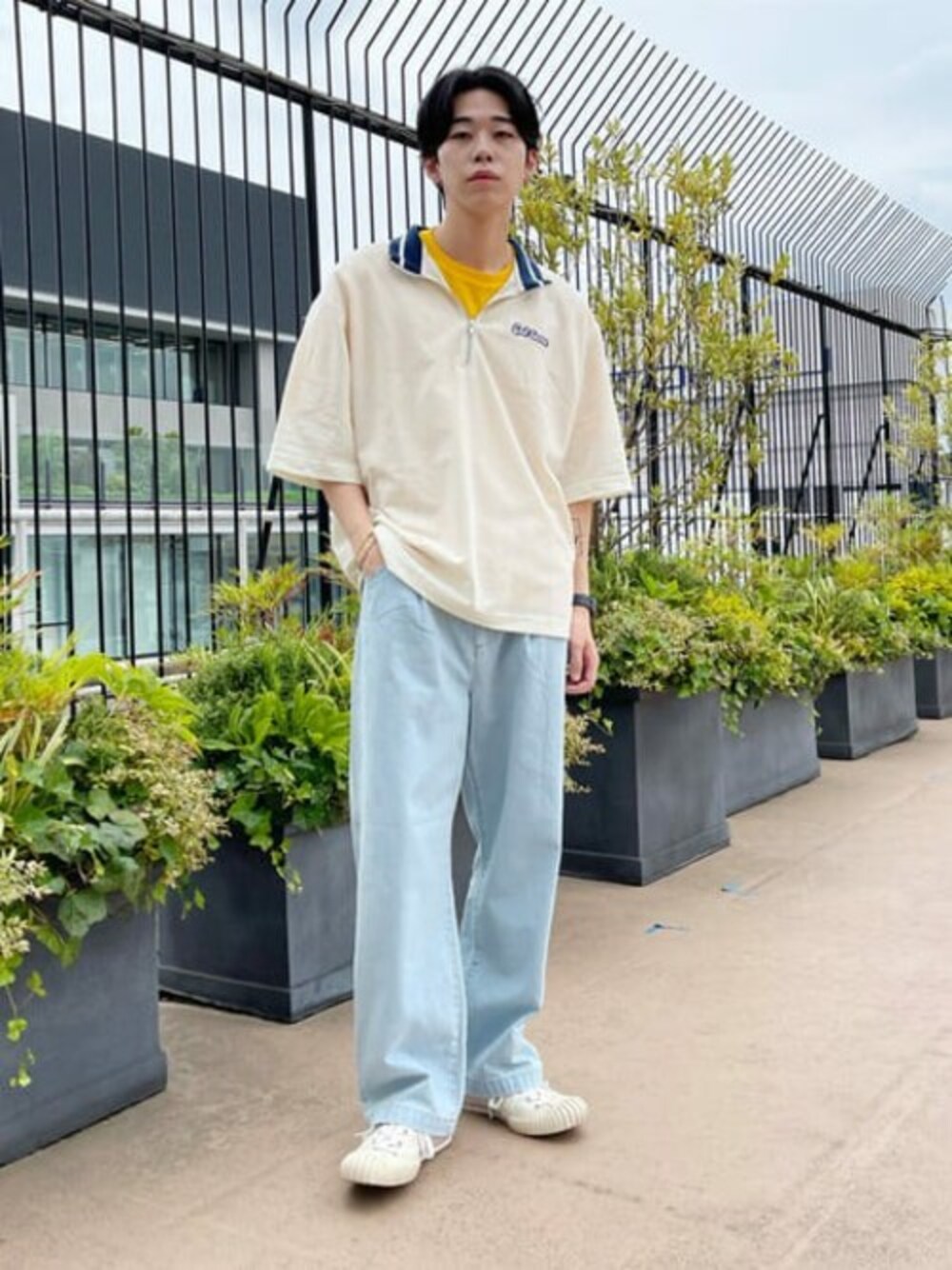 淡めのトーンでまとめ、黄色の差し色が◎ デニムにはステッチで黄色が使われることが多く(特にインディゴ系)黄色は相性抜群なんです!! トレンドのハーフジップアイテムも注目です!