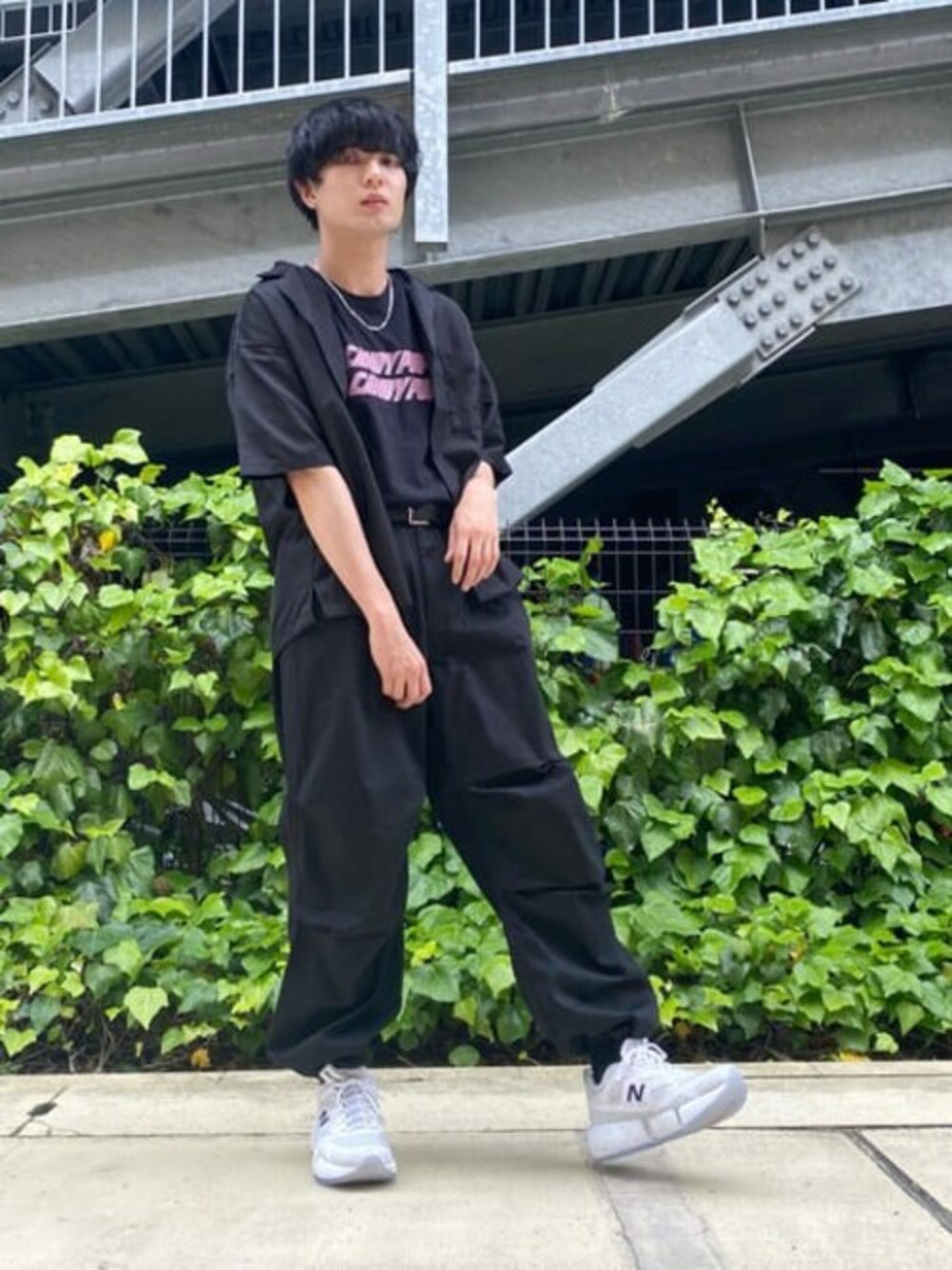 オールブラックコーデ!プリントTのピンクがワンポイントのアクセントになってて可愛い! たくさん種類あるのでTシャツ変えるだけでも見え方変わってきますよー!