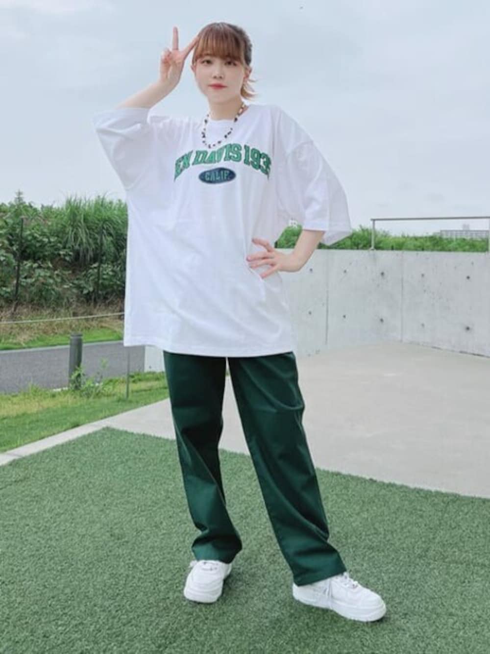 白T×グリーンのパンツでコーデを組みました! Tシャツのロゴの緑とパンツの色を合わせました!Tシャツのロゴは大きめで可愛いです!