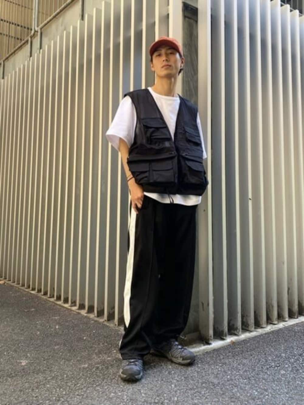 メッシュベストを使った、ストリートコーデ。 モノクロコーデに差し色で、オレンジを入れることでバランス◯