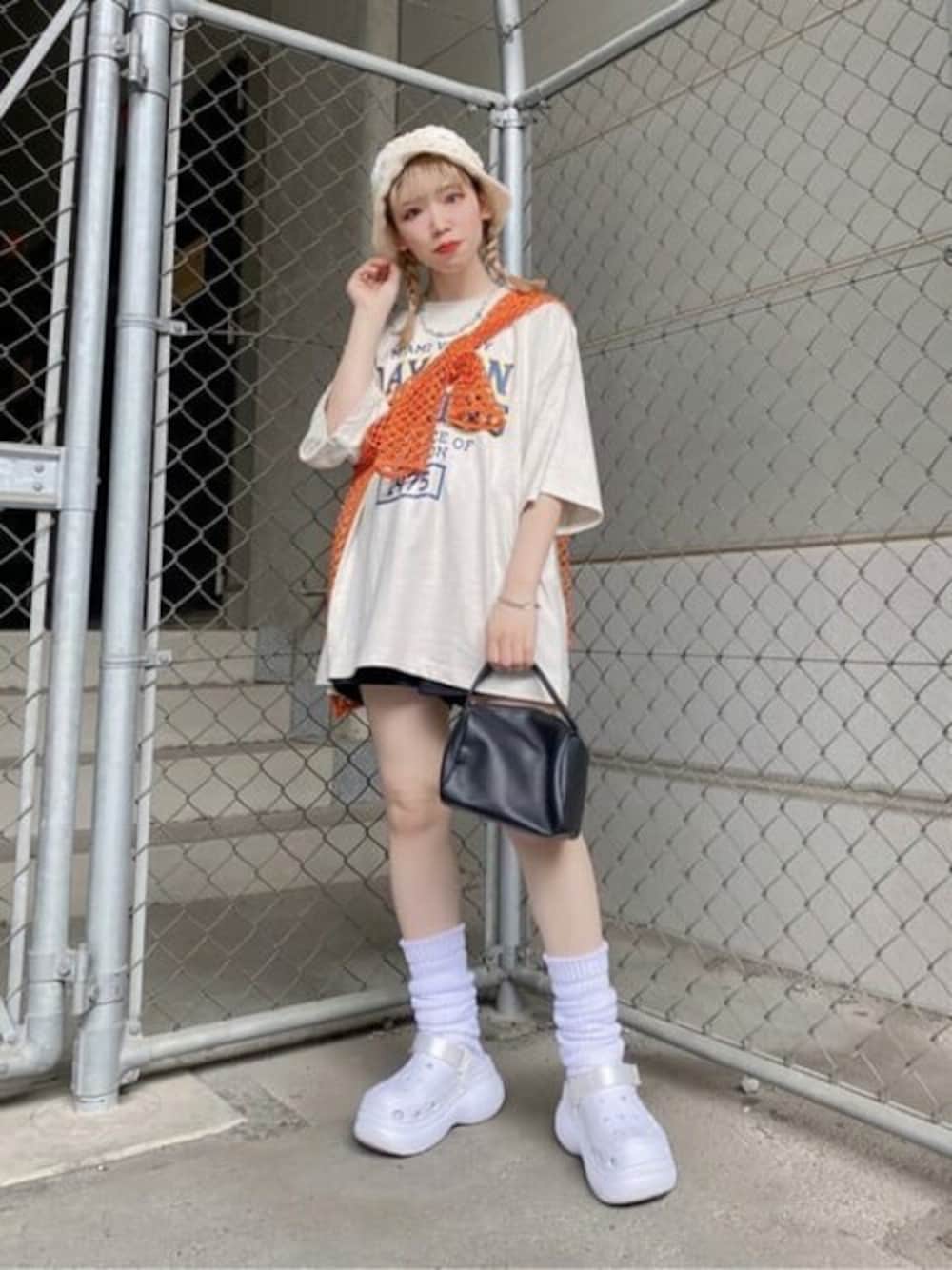 ルーズシルエットが可愛いヘビーウエイトカレッジロゴBIGT♬︎ Mサイズでもゆったり着れるので、女の子はワンピっぽく着ても良き!! 肉厚な生地感で透け感気にせず着れます◎ アクセントでメッシュろんTをたすき掛けにしてみました! 簡単にお洒落見えするのでおすすめです♬︎