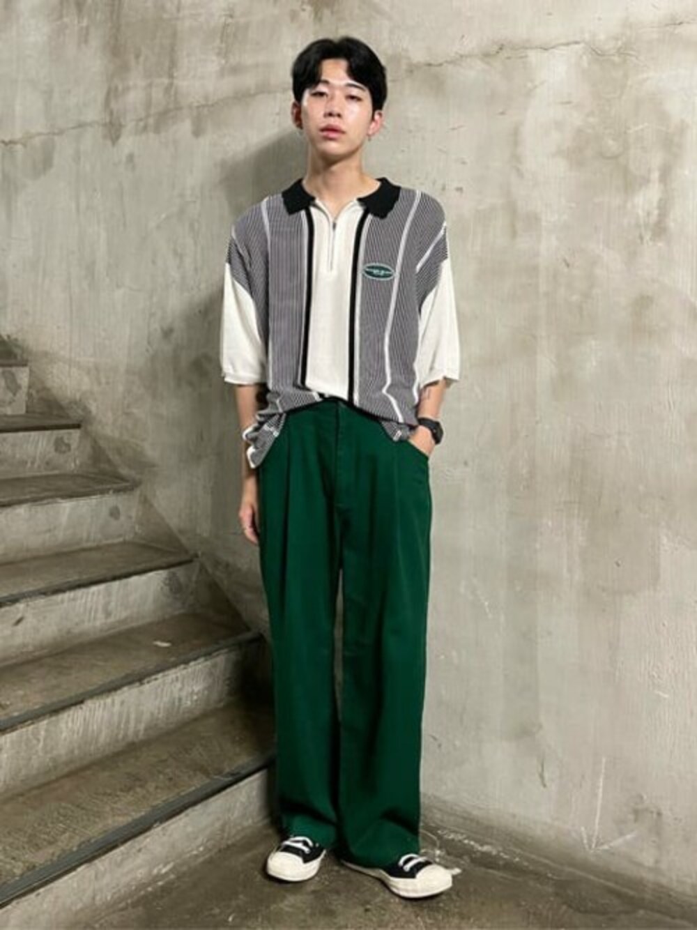 インパクトあるポロシャツの古着LIKEコーデ!! リネンっぽいポロシャツが合わせやすくてオススメ!! 柄っぽいですが、ブラックとグリーンのカラーリングは扱いやすいです★