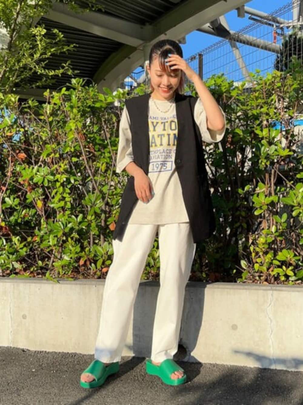 新作のジレを使った大人カジュアルコーデ🖤 ネックレスやサンダルでカラーを取り入れて遊び心をプラスしてみました🌈