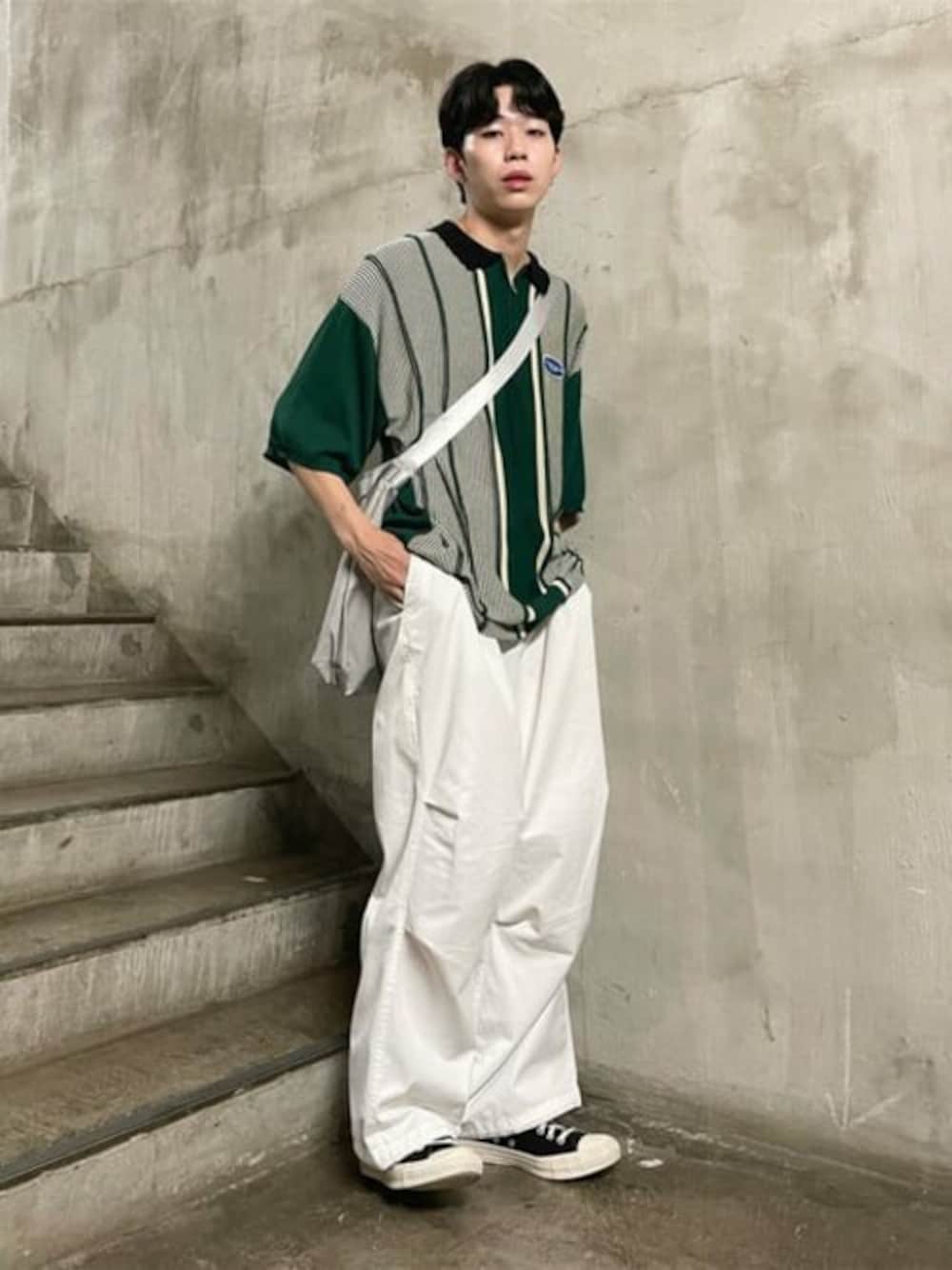 今回はスケーターストリートコーデ! ホワイトのワイドパンツに暗めのダークグリーンデザインポロシャツがかっこいい! トップスもボトムスも全体的にゆるゆるで合わせるとシルエットが可愛い! 学生にも人気なショルダーバッグも大きめでデザイン、機能性共に◎