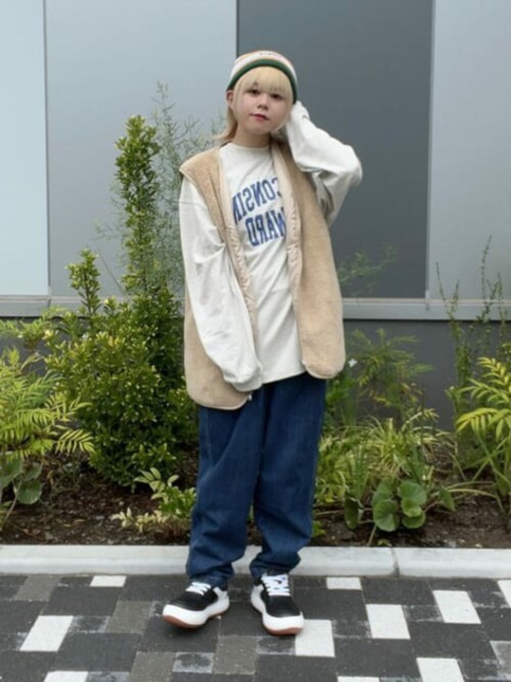今期のオススメアイテム!! ボアベストを使った 古着風カジュアルコーデ:D ポンポン付きのニット帽も とで可愛いですよね◎