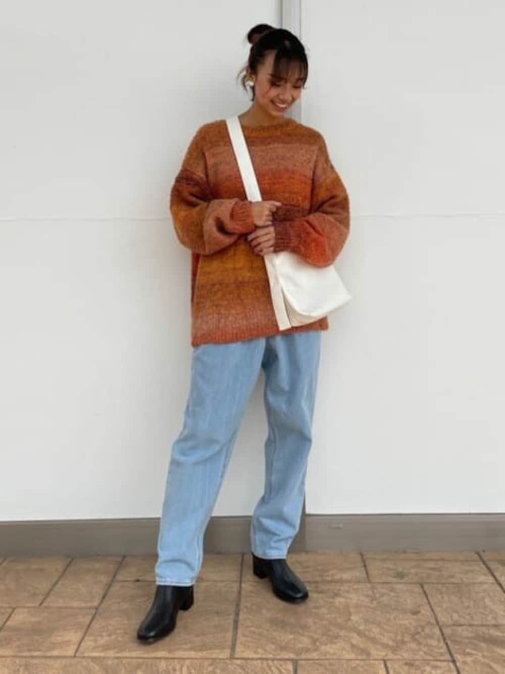 ご覧いただきありがとうございます! 今回は新作のグラデーションビックニットを使ったコーデです!! ビックニットなので高身長の私でもダボッと大きめに着ることが出来ます! デザインも秋っぽくて可愛いのでとてもオススメです!!