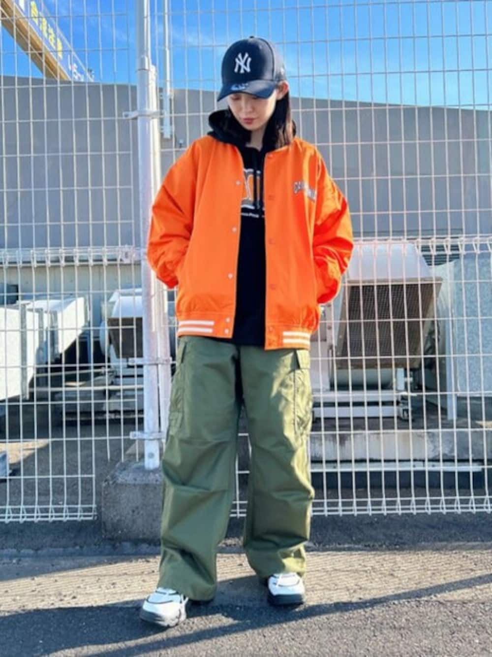 ご覧いただきありがとうございます♪ スタジャンとスウェットのロゴのオレンジを揃えたのがポイントです! オレンジとカーキの組み合わせは鉄板でかわいいですよね!!
