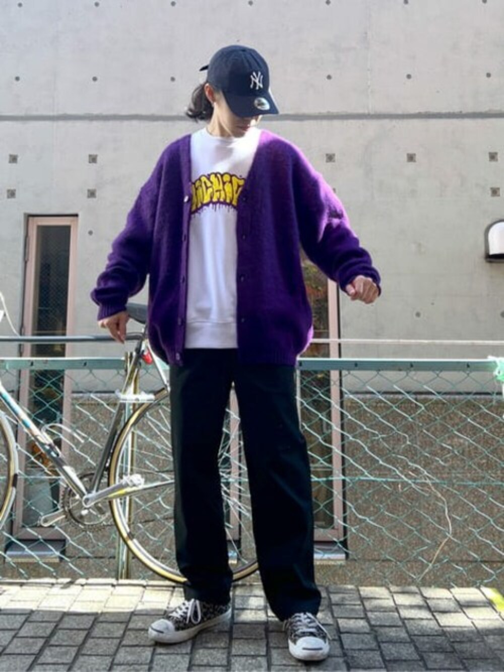 パープルコーデ! さりげなくスウェットの色をカーディガンで拾ってます◎ ニューエラのキャップは本当に季節関係なくずっと使えるアイテム!
