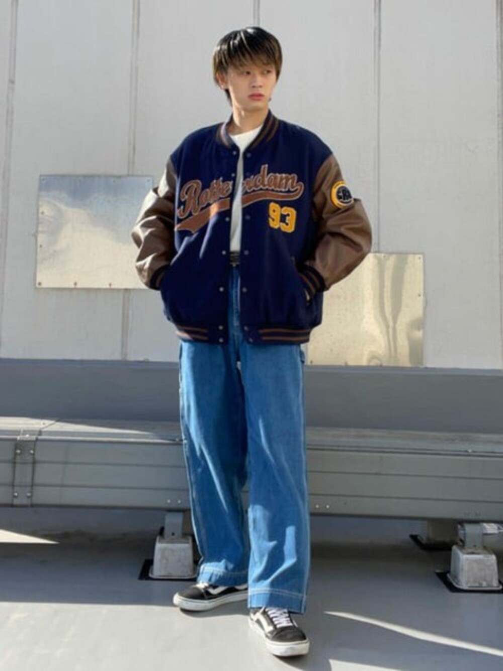 スタジャンに白シャツとデニムで合わせて、シンプルかつスタイリッシュな印象に! 僕のような細身体型な方でも着れて、今年"1"みんなにオススメのお出かけコーデです!!! 腕の部分がレザーで高見えするしオススメです!
