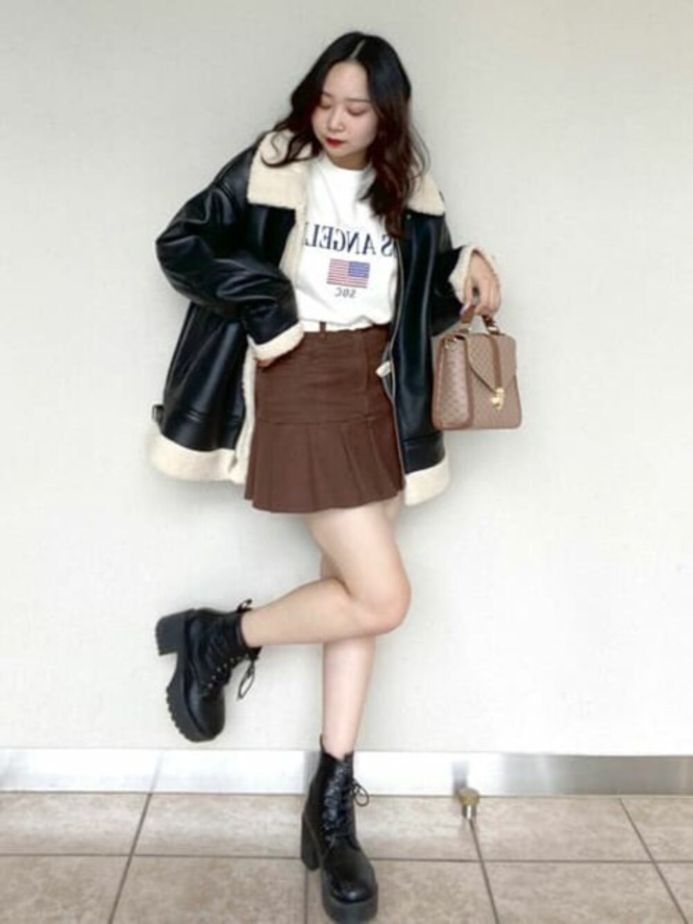アウターで大人っぽさを出してホワイト×ブラウンで可愛らしさも足したコーデです! スカートも履き心地よくオススメです!スウェットは着回ししやすいので1枚持っておくと便利です!
