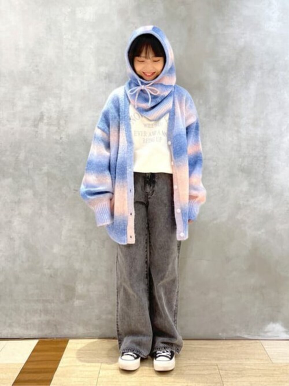 トレンドのグラデーションアイテムを使ったコーデ♡ 冬本番はボタンを全部しめてトップスとして使うのがおすすめです! バラクラバは被ることで寒さ対策にも◉あったかくて可愛いアイテムです!