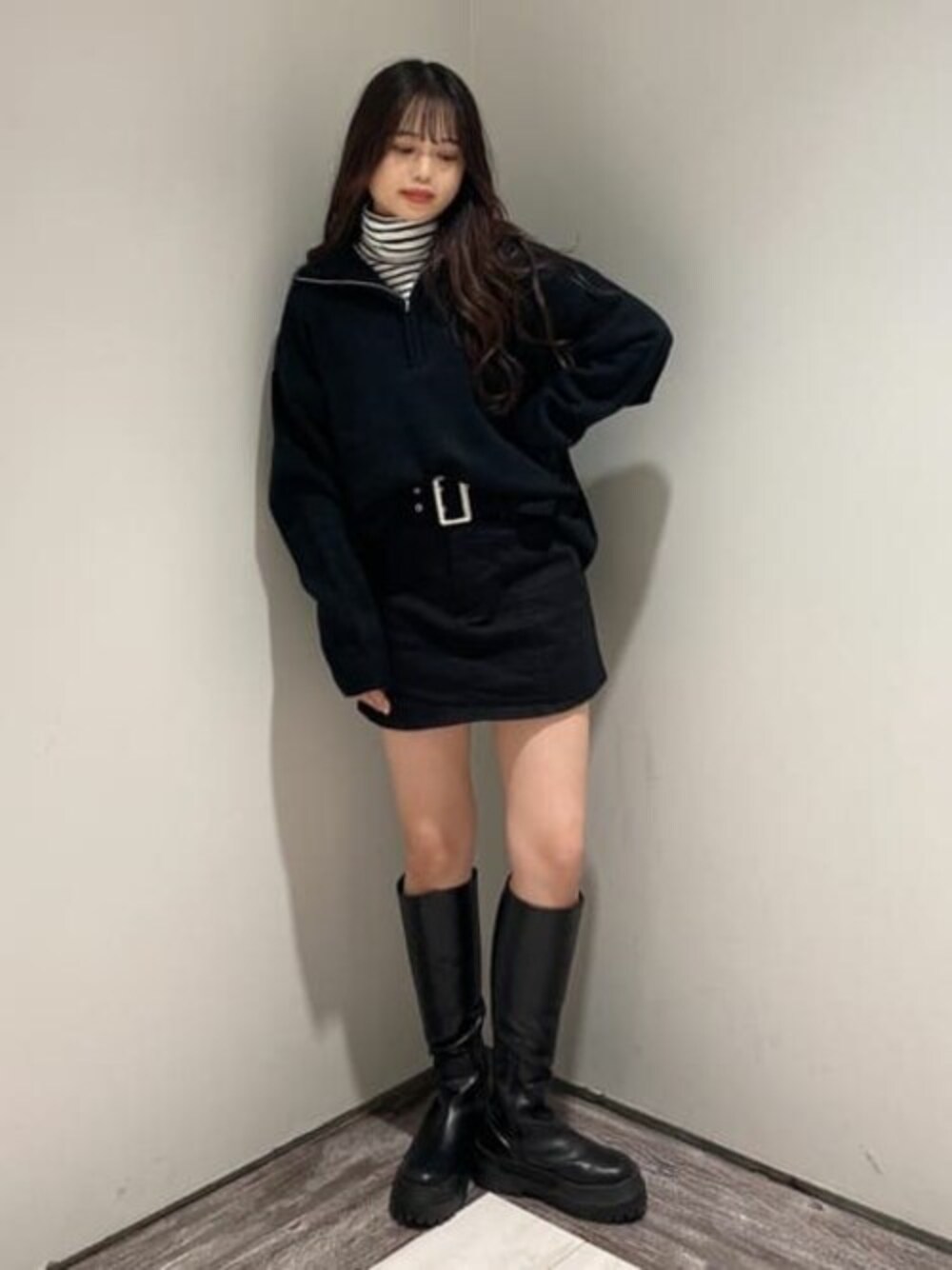 大人気のハーフジップニット❕ インナーにストライプのタートルロンTを合わせました🌟 ニットはタックインしても出して着ても可愛いです♥