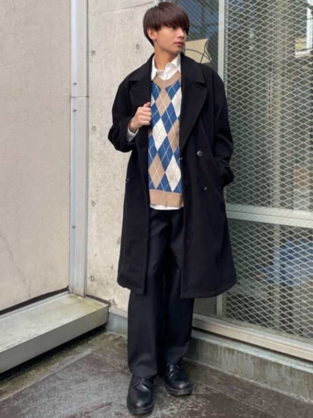 ニットベストとシャツを使ってキレイめコーデにしました!! キレイめの王道、ロングコートを羽織ることでよりクールでカッコいいテイストが出ます!