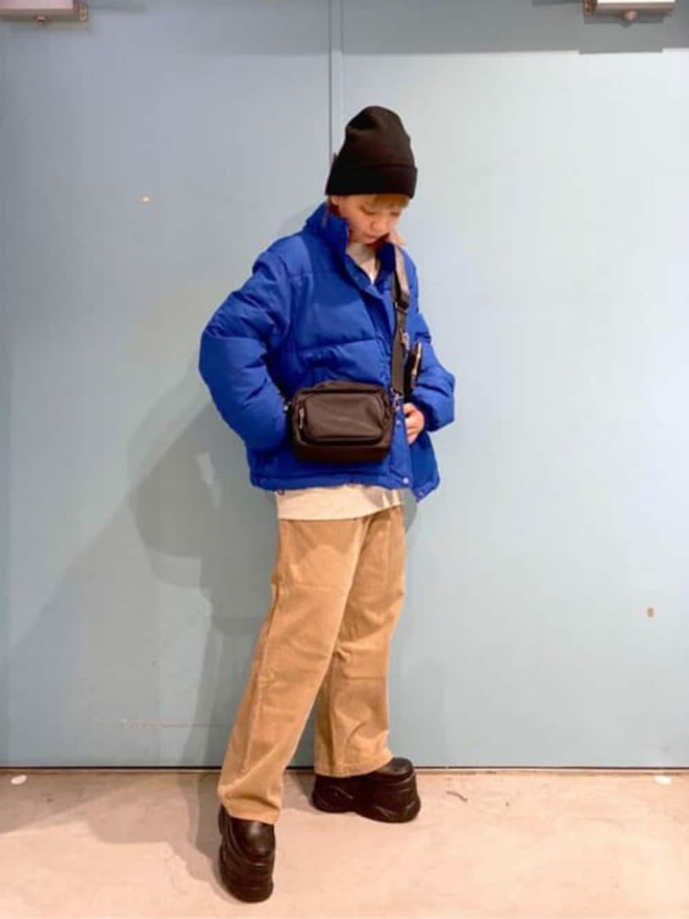 青のパデッドブルゾンが目を引くコーデ! 小物は全体的に黒で統一 グレーのスウェット×ベージュのコーデュロイパンツで少し色味を抑え目にして青が映えるコーデに! 防寒にも可愛いアウターを!