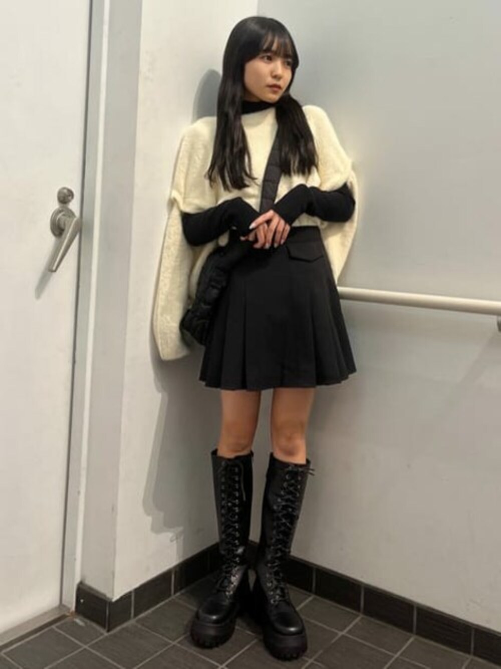 3wayくらい便利で使えちゃうカーディガンを使ったモノトーンガーリーコーデです。 袖は取り外し可能で、1枚目のように着たり、袖を取ったりなどさまざまな着こなしができます。 ポケットの付いたプリーツスカートで大人カジュアルに。 もちもちもふもふした素材なので冬のデートにすごくおすすめです。